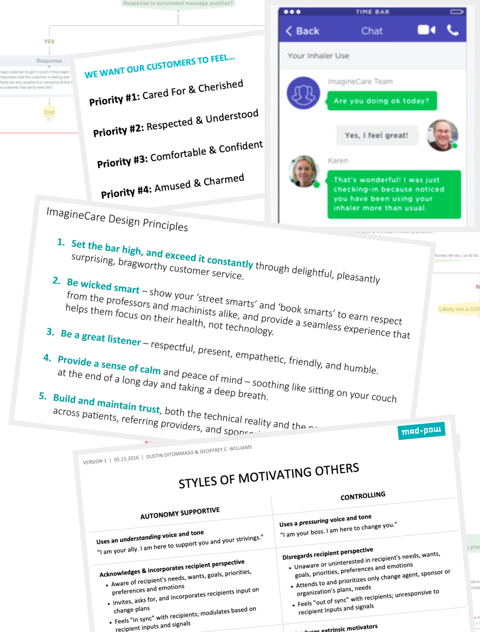 The chat message library for the bot was shaped by design principles defined through activities I facilitated with the clinical product team throughout the design process, as well as a behavior change design workshop facilitated by my colleague and mentor Dustin DiTommaso.
