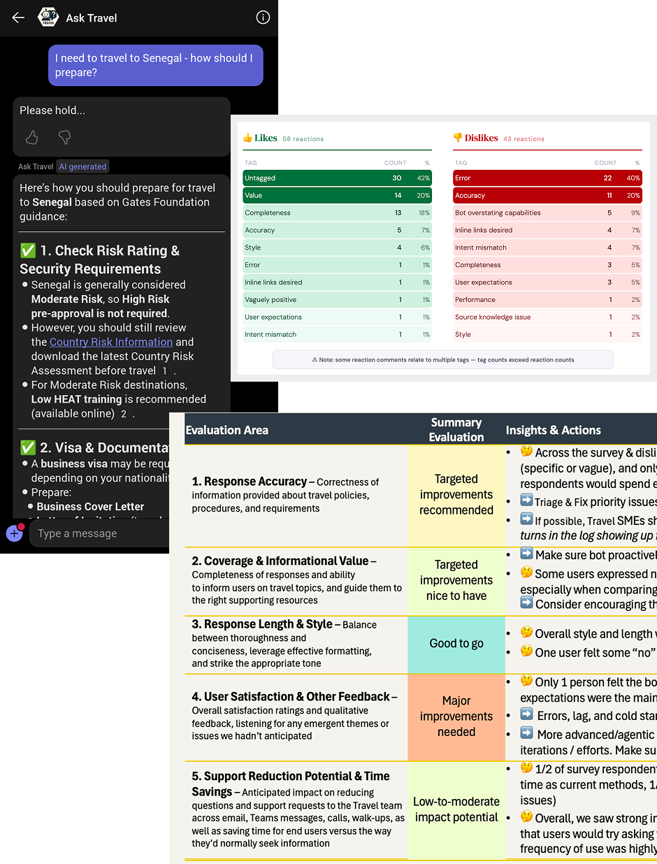 The Gates Foundation's global travel program is genuinely complex – staff range from first-time conference attendees to program officers spending months in the field. Travel is often to countries with specific business visa requirements and high-risk security considerations. When the Travel team and IT collaborated on an MVP chatbot built in Microsoft Copilot Studio to handle policy, logistics, visa, and travel security questions, my role was to determine whether it was ready to meet that complexity at org-wide scale.